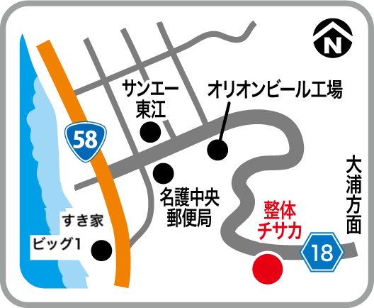 やんばる方面から、名護漁港の次の信号の「歩道橋」の交差点を左折して、オリオンビール名護工場へ向かって下さい。