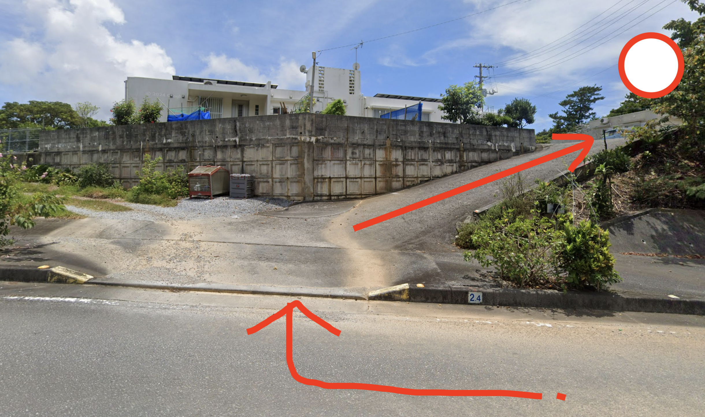 しばらく坂道が緩やかになる左カーブ手前で、右側に見える住宅の「手前側の急坂」を登った家が目的地です。